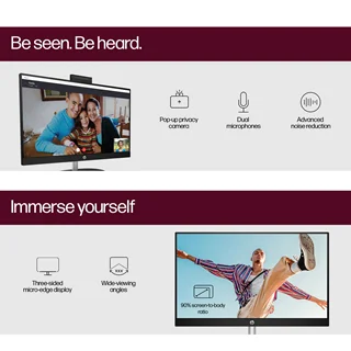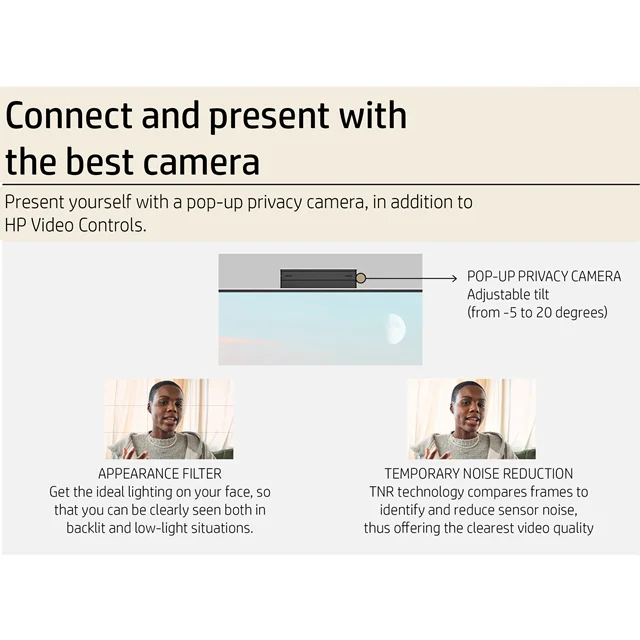 - برای تسهیل همکاری و ارتباطات، این کامپیوتر مجهز به دوربین پاپآپ با قابلیت شیبدهی برای حفظ حریم خصوصی، میکروفونهای دوگانه و فناوری پیشرفته کاهش نویز است.